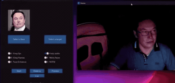 博主 MatthewBerman 使用了一张伊隆·马斯克的图片生成了直播流,测试了暗光条件和点光源的条件——常规情况下较难处理的场景,但是 Deep-Live-Cam 的表现都非常丝滑,暗光条件下的甚至更像马斯克了。甚至博主戴着眼镜这一点,也几乎没有影响生成的效果。