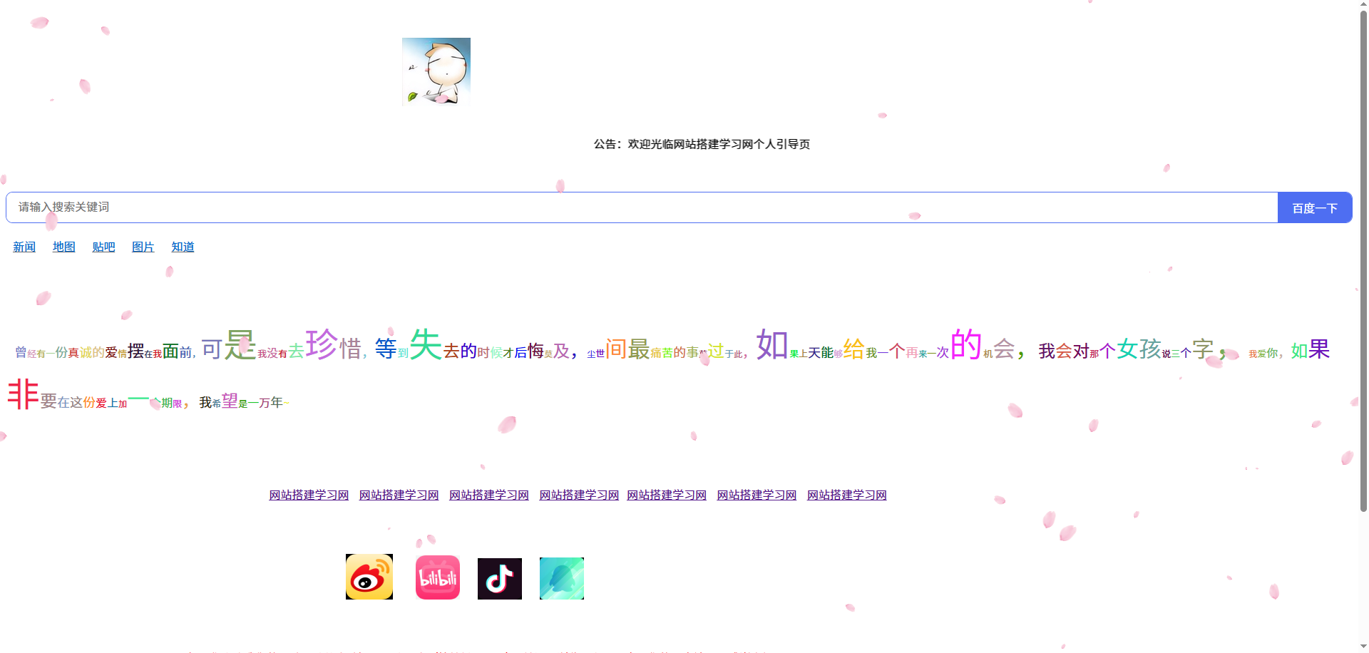 功能:含有公告、百度搜索、鼠标点击弹出爱心、樱花特效、访客统计。