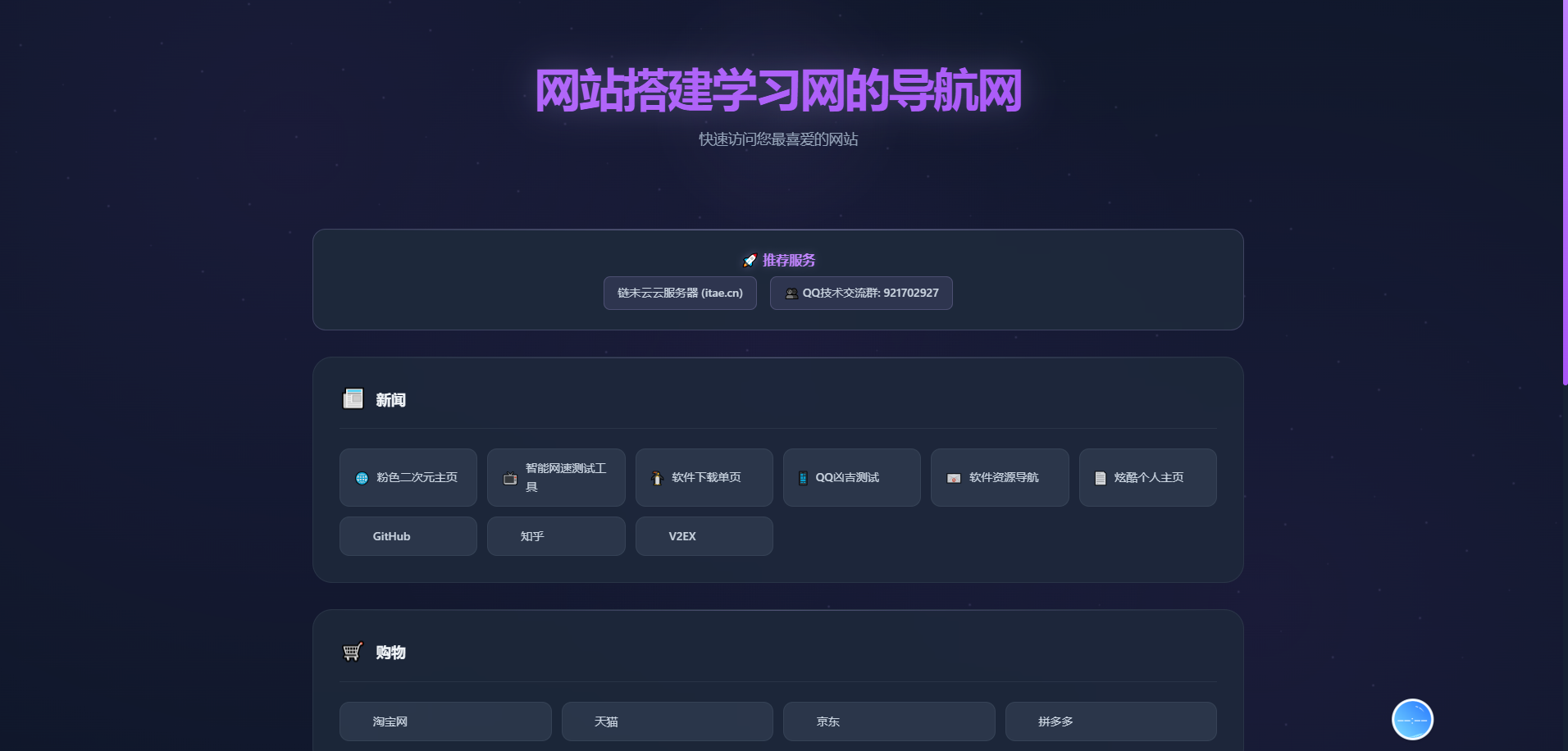 一个现代化、简约而炫酷的网站导航页面,采用深色主题配紫色特效系统,为用户提供快速访问常用网站的便捷入口。