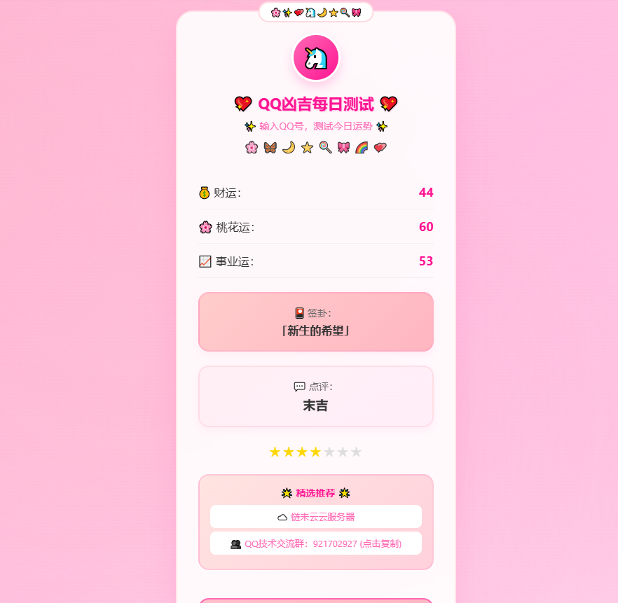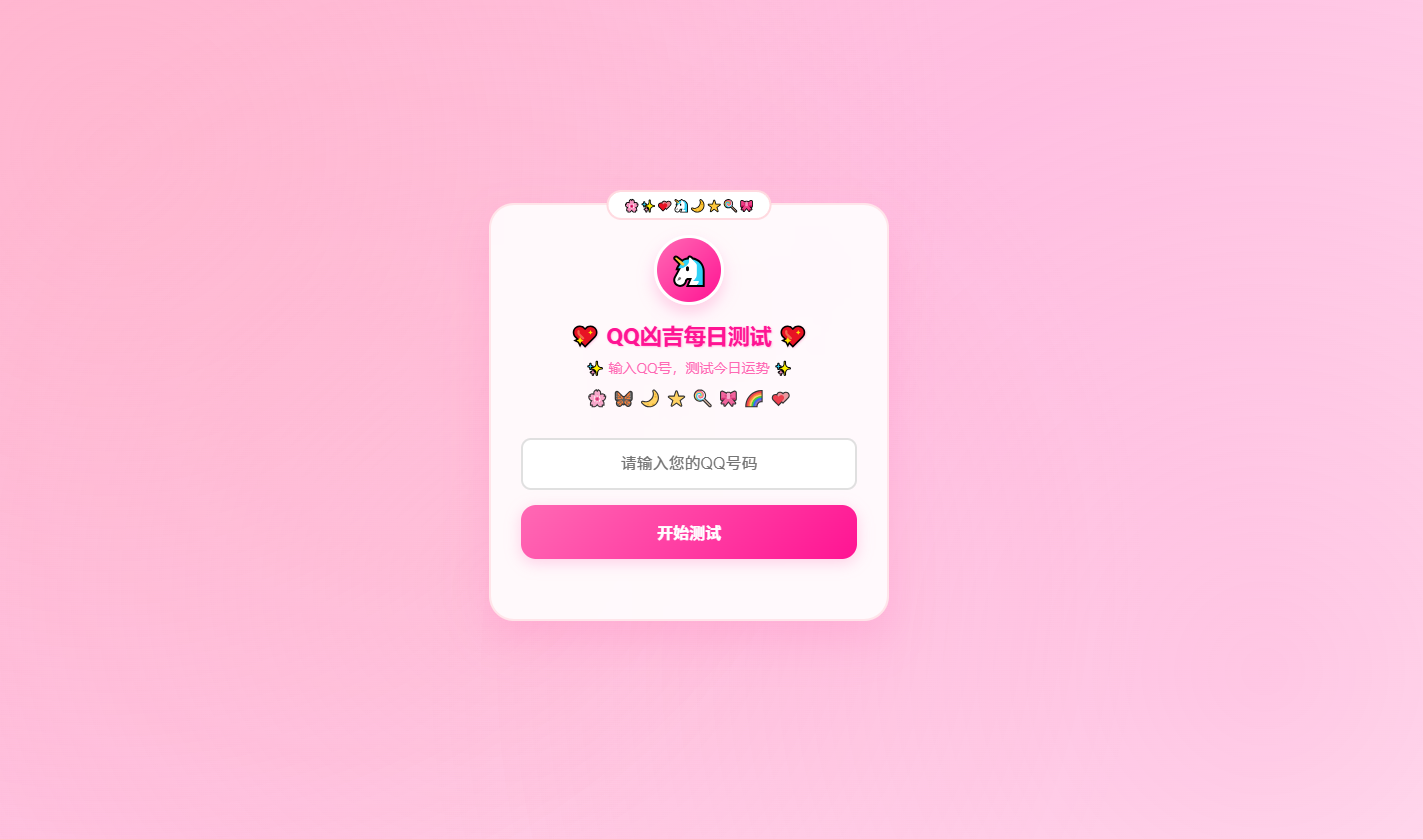 这是一个超级可爱的 QQ 每日运势测试网页应用,采用梦幻粉白色系设计,