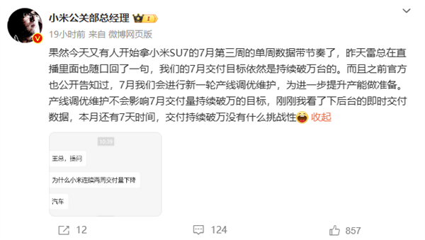 果然今天又有人开始拿小米SU7的7月第三周的单周数据带节奏了,昨天雷总在直播里面也随口回了一句,我们的7月交付目标依然是持续破万台的。而且之前官方也公开告知过,7月我们会进行新一轮产线调优维护,为进一步提升产能做准备。