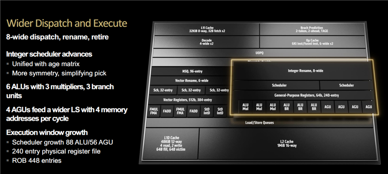Zen 4拥有3×24一体化ALU/AGU Scheduler和单独的1×24 ALU Scheduler,总计是96个。Zen 5则设计了88 ALU Scheduler和56 AGU Scheduler,理论上可提升50%的运算吞吐量。